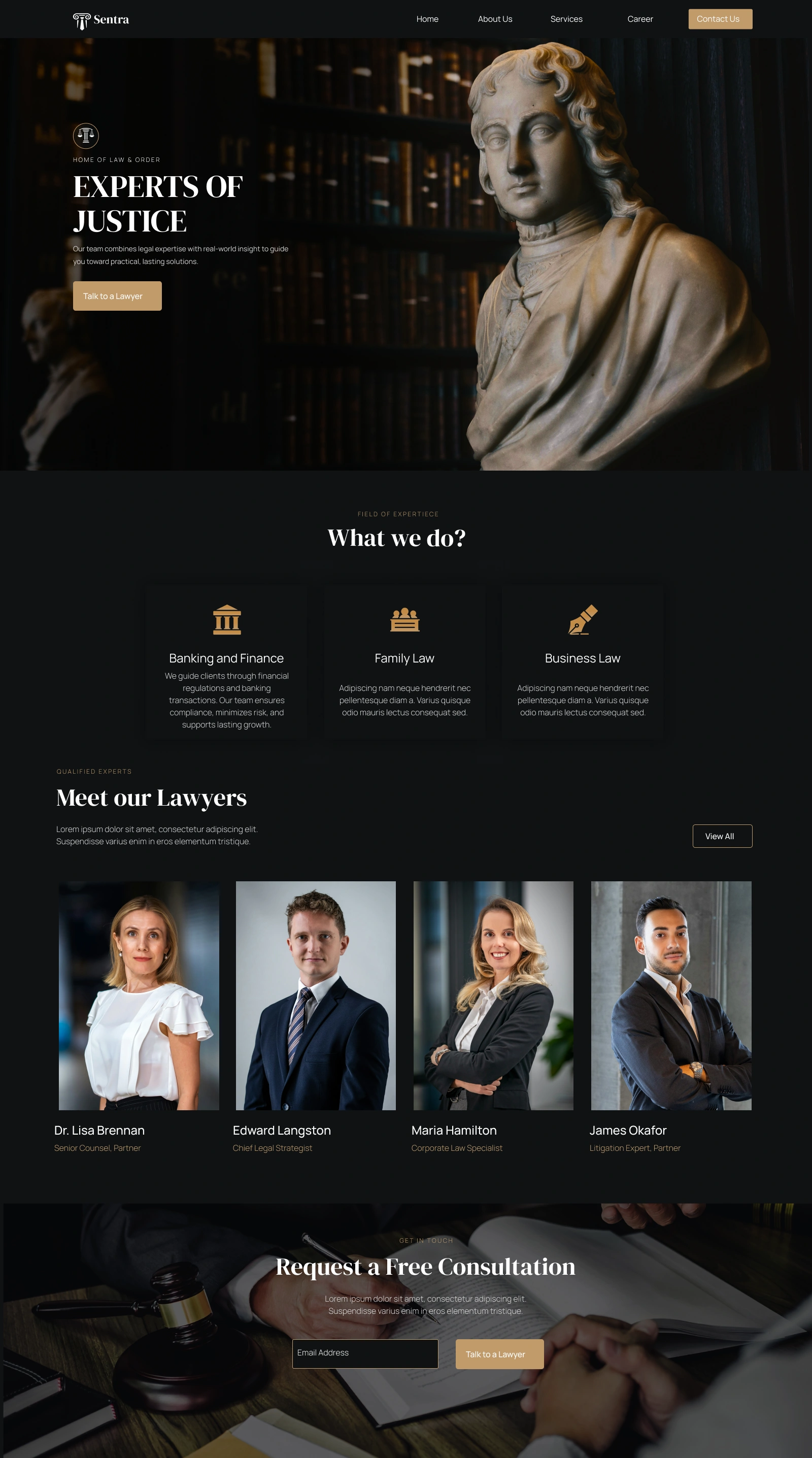We designed and developed a modern website for Sentra, a full-service law firm, with a focus on trust, clarity, and seamless user experience. The platform highlights the firm’s expertise, communicates credibility, and provides an intuitive pathway for clients to request legal consultations.